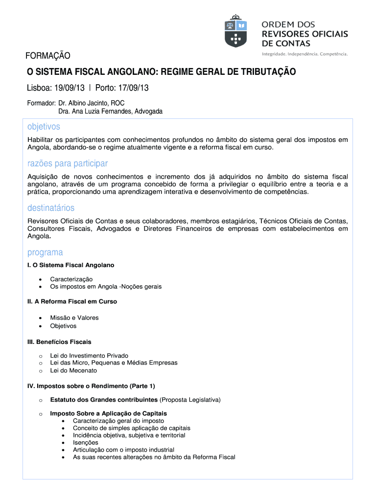 FORMAT O SYSTEM FISCAL ANGOLAN: REGIME GERALD DE TRIBUTE Lisbon: 19/09/13 Porto: 17/09/13 Toreador: Dr. Albino Jacinto, ROC DRA. Ana Lucia Fernandes, Advocate objectives Habilitate OS participants