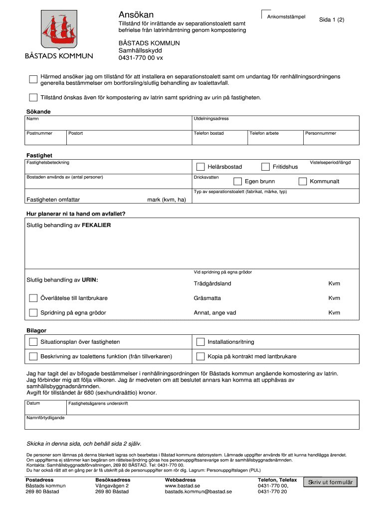Get the free Tillstnd fr inrttande av separationstoalett samt - bastad