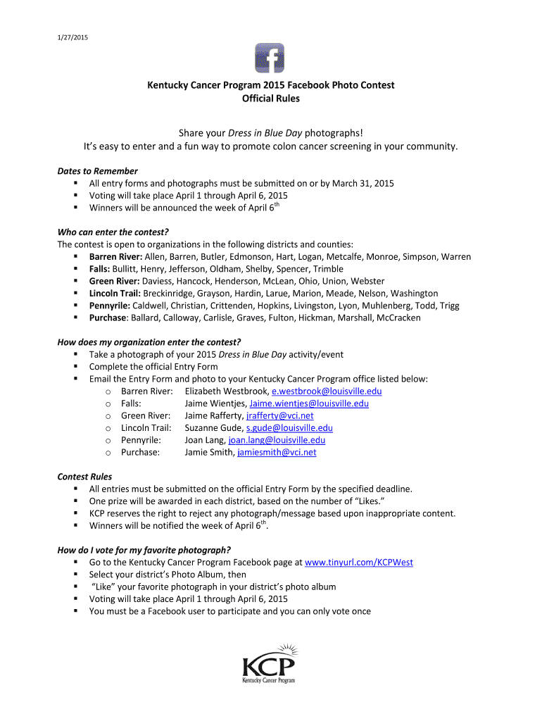 1/27/2015 Kentucky Cancer Program 2015 Facebook Photo Contest Official Rules Share your Dress in Blue Day photographs! It's easy to enter and a fun way to promote colon cancer screening in your community.