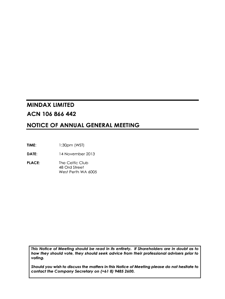 MIN DAX LIMITED ACN 106 866 442 NOTICE OF ANNUAL GENERAL MEETING TIME: 1:30pm (WST) DATE: 14 November 2013 PLACE: The Celtic Club 48 ORD Street West Perth WA 6005 This Notice of Meeting should be