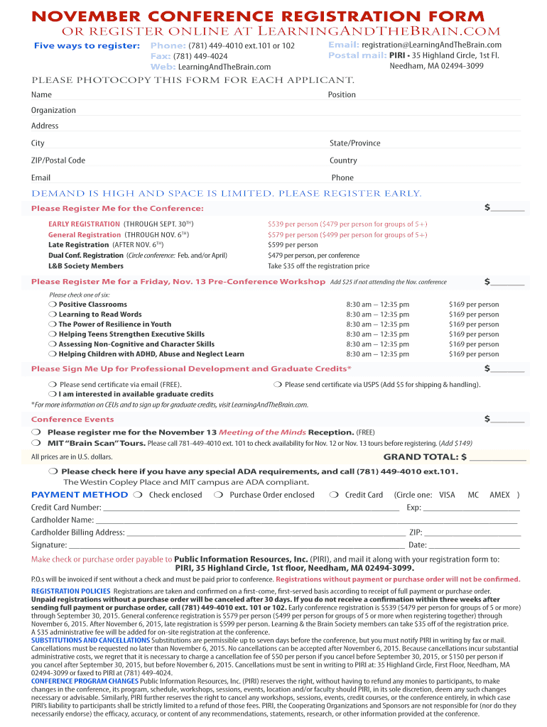 NOVEMBER CONFERENCE REGISTRATION FORM OR REGISTER ONLINE AT L EARNING A ND The B RAIN.COM Five ways to register: Phone: (781) 4494010 ext.101 or 102 Fax: (781) 4494024 Web: LearningAndTheBrain.com