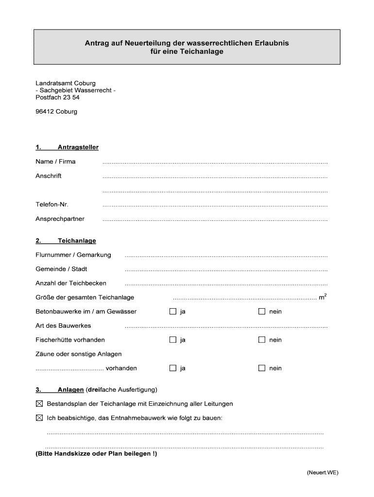 Ant rag AUF Neuerteilung her wasserrechtlichen Erlaubnis for and Teichanlage Landratsamt Coburg Sachgebiet Wasserrecht Postal 23 54 96412 Coburg 1. Antragsteller Name / Firm ..........................................................................................................................