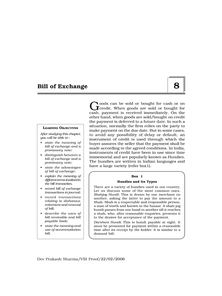 8 Bill of Exchange G LEARNING OBJECTIVES After studying this chapter, you will be able to : state the meaning of bill of exchange and a promissory note; distinguish between a bill of exchange and