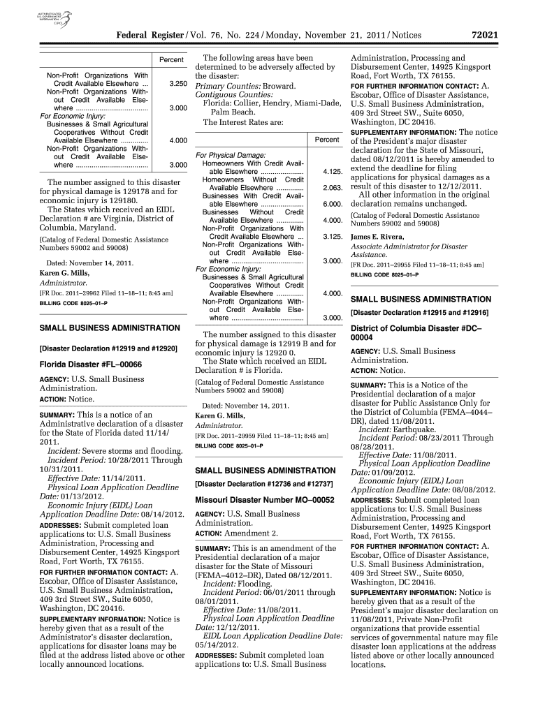 This document includes notices regarding federal disaster declarations for various states, detailing the effects of disasters and the availability of loans for affected businesses and non-profit organizations.