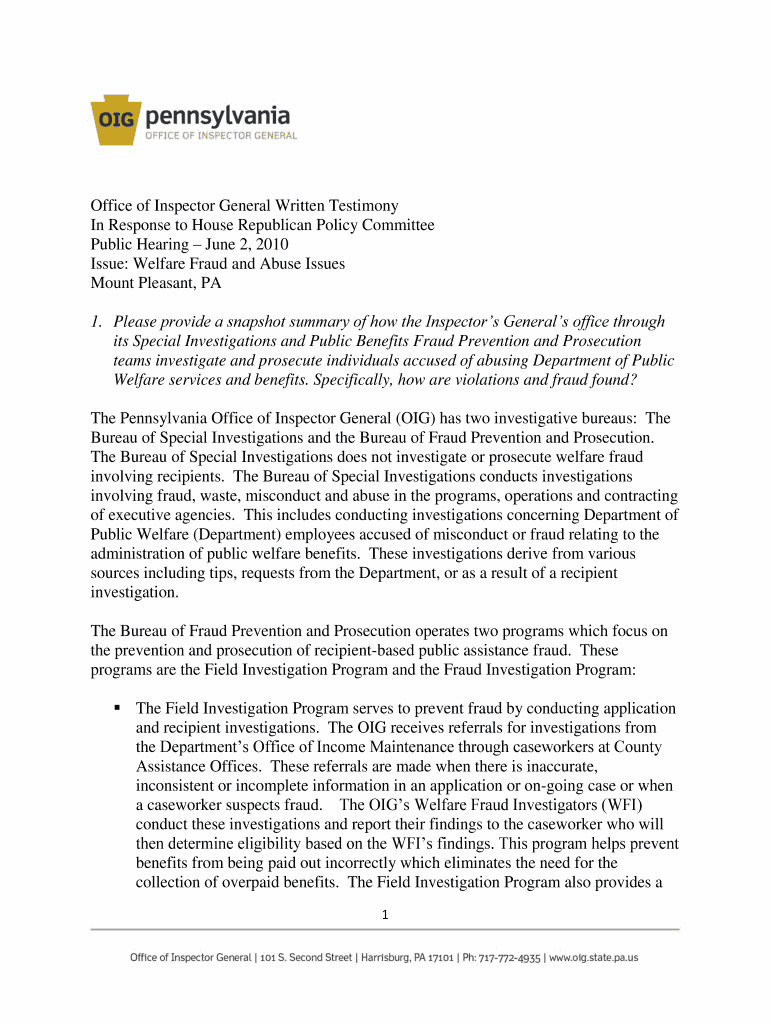 Office of Inspector General Written Testimony In Response to House Republican Policy Committee Public Hearing June 2, 2010, Issue: Welfare Fraud and Abuse Issues Mount Pleasant, PA 1. Please provide