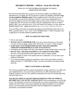 SSA 3441 is a form used by the Social Security Administration (SSA) to collect information from individuals who are applying for or receiving disability benefits. It is also known as the Disability Report - Appeal. This form helps the SSA gather essential details about the applicant's medical conditions, work history, and other relevant information that is necessary to determine their eligibility for disability benefits.