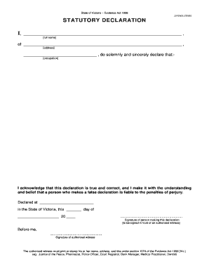 The Victorian Statutory Declaration Form is a legal document used to declare the truth of certain facts in Victoria, Australia. It is commonly used to make formal statements, affirmations, or declarations under law.