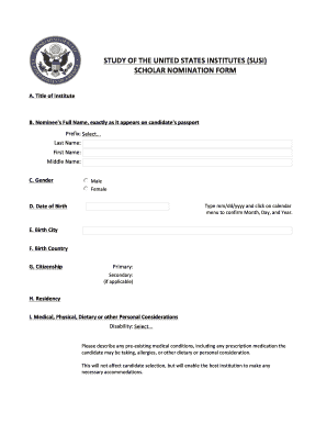 A Nomination form pdf is a document used to nominate candidates for a specific purpose or position. It typically includes fields for the nominee's name, contact information, qualifications, and other relevant details.