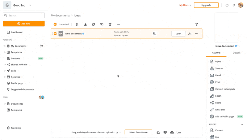 The upload menu has a fresh new look. We’ve made it cleaner and more convenient to navigate. Click Add New in My Documents and select the option you need to open it.