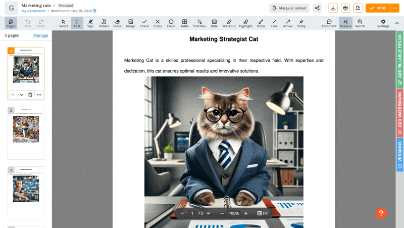 Need to reduce the size of a document filled with images and pages? Try our new Compress tool! Open the document in the editor, then click Compress in the top toolbar next to the Done button. Select the compression level that suits your needs—High for the best quality or Low for the smallest file size. You can compress different file formats, not just PDFs.